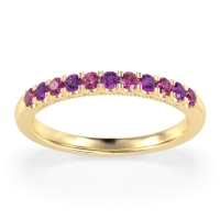 This Pink Tourmaline wedding ring is casted in 14k Yellow Gold and set with fine quality Pink Tourmaline and Amethyst. All of the gemstones we use are of the top 10% available, those found in fine quality boutiques across the world. This Pink Tourmaline wedding band can also be added to your collection of minimalist Pink Tourmaline rings. This Band Showcases Round Stones in A Scallop Setting, with Delicate Milgrain Edging The Shank. Free shipping, returns, resizing, and a lifetime warranty ensure you love your purchase.