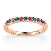 This Pink Tourmaline wedding ring is casted in 18K Rose Gold and set with fine quality Pink Tourmaline and Emerald. All of the gemstones we use are of the top 10% available, those found in fine quality boutiques across the world. This Pink Tourmaline wedding band can also be added to your collection of minimalist Pink Tourmaline rings. This Band Showcases Round Stones in A Scallop Setting, with Delicate Milgrain Edging The Shank. Free shipping, returns, resizing, and a lifetime warranty ensure you love your purchase.