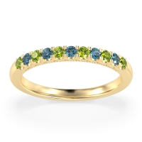 This Peridot wedding ring is casted in 14k Yellow Gold and set with fine quality Peridot and London Blue Topaz. All of the gemstones we use are of the top 10% available, those found in fine quality boutiques across the world. This Peridot wedding band can also be added to your collection of minimalist Peridot rings. This Band Showcases Round Stones in A Scallop Setting, with Delicate Milgrain Edging The Shank. Free shipping, returns, resizing, and a lifetime warranty ensure you love your purchase.
