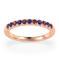 This Ruby wedding ring is casted in 18K Rose Gold and set with fine quality Ruby and Blue Sapphire. All of the gemstones we use are of the top 10% available, those found in fine quality boutiques across the world. This Ruby wedding band can also be added to your collection of minimalist Ruby rings. This Band Showcases Round Stones in A Scallop Setting, with Delicate Milgrain Edging The Shank. Free shipping, returns, resizing, and a lifetime warranty ensure you love your purchase.