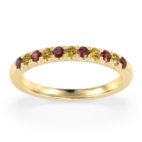 This Ruby wedding ring is casted in 14k Yellow Gold and set with fine quality Ruby and Citrine. All of the gemstones we use are of the top 10% available, those found in fine quality boutiques across the world. This Ruby wedding band can also be added to your collection of minimalist Ruby rings. This Band Showcases Round Stones in A Scallop Setting, with Delicate Milgrain Edging The Shank. Free shipping, returns, resizing, and a lifetime warranty ensure you love your purchase.