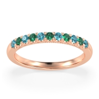 This Swiss Blue Topaz wedding ring is casted in 18K Rose Gold and set with fine quality Swiss Blue Topaz and Emerald. All of the gemstones we use are of the top 10% available, those found in fine quality boutiques across the world. This Swiss Blue Topaz wedding band can also be added to your collection of minimalist Swiss Blue Topaz rings. This Band Showcases Round Stones in A Scallop Setting, with Delicate Milgrain Edging The Shank. Free shipping, returns, resizing, and a lifetime warranty ensure you love your purchase.