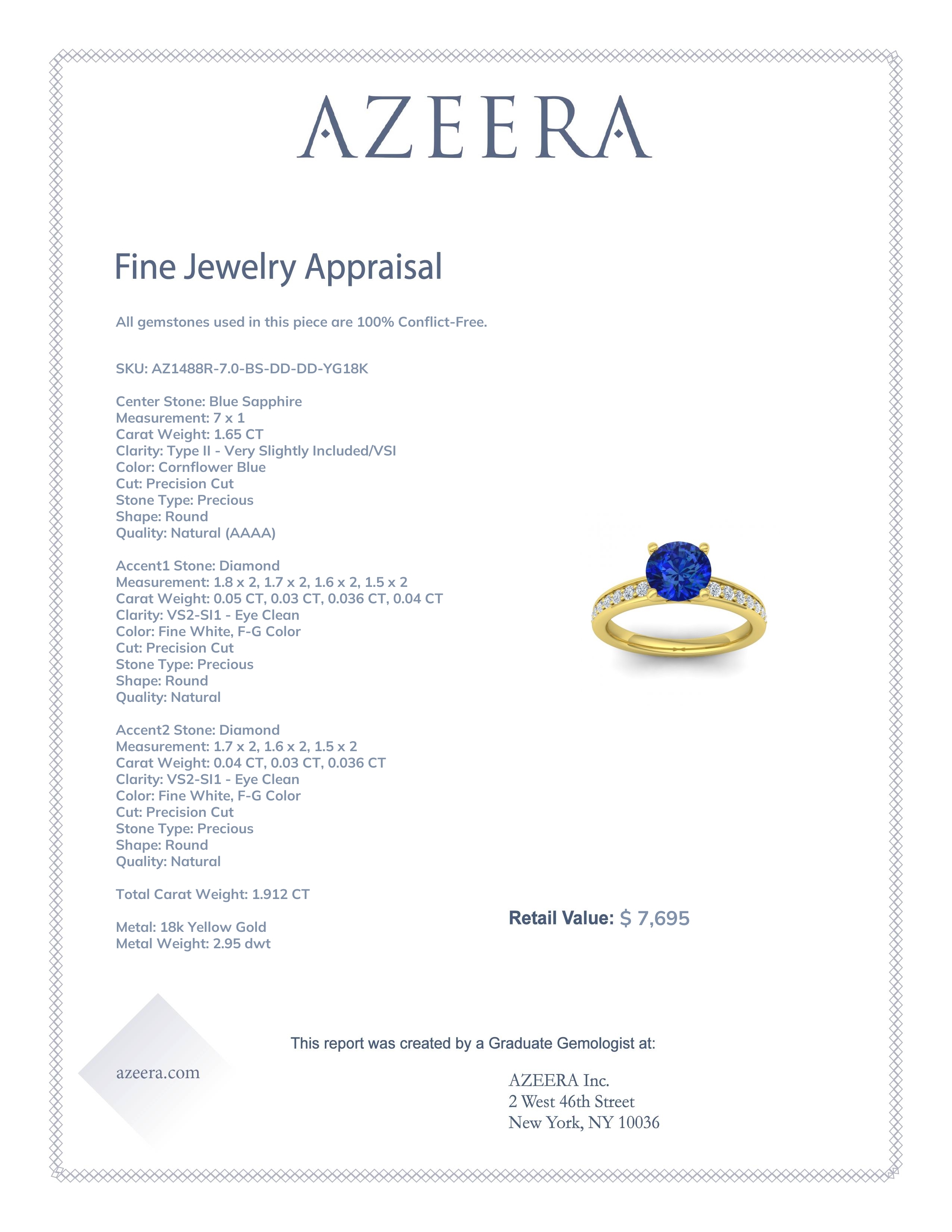 This 18k Yellow Gold Blue Sapphire ring features a Round Blue Sapphire, along with fine quality Diamond. This Trendy Ring Is All About Showing Off The Center Stone. Your Round Brilliant Gem Sits in Raised 4 Prong Open Peg Head Setting Making The Gem Easily Visible From All Angles. in Between Secure Walls, A Pave Of Smaller Round Brilliant Gems Runs Along The Upper Half Of The Band. We only use the top 10% of gems available, those found in the finest jewelry shops across the world. This Blue Sapphire engagement ring can also be worn as an Blue Sapphire and Diamond gemstone ring and added to your collection! Enjoy Free Shipping and Returns, Free Resize and a lifetime warranty.