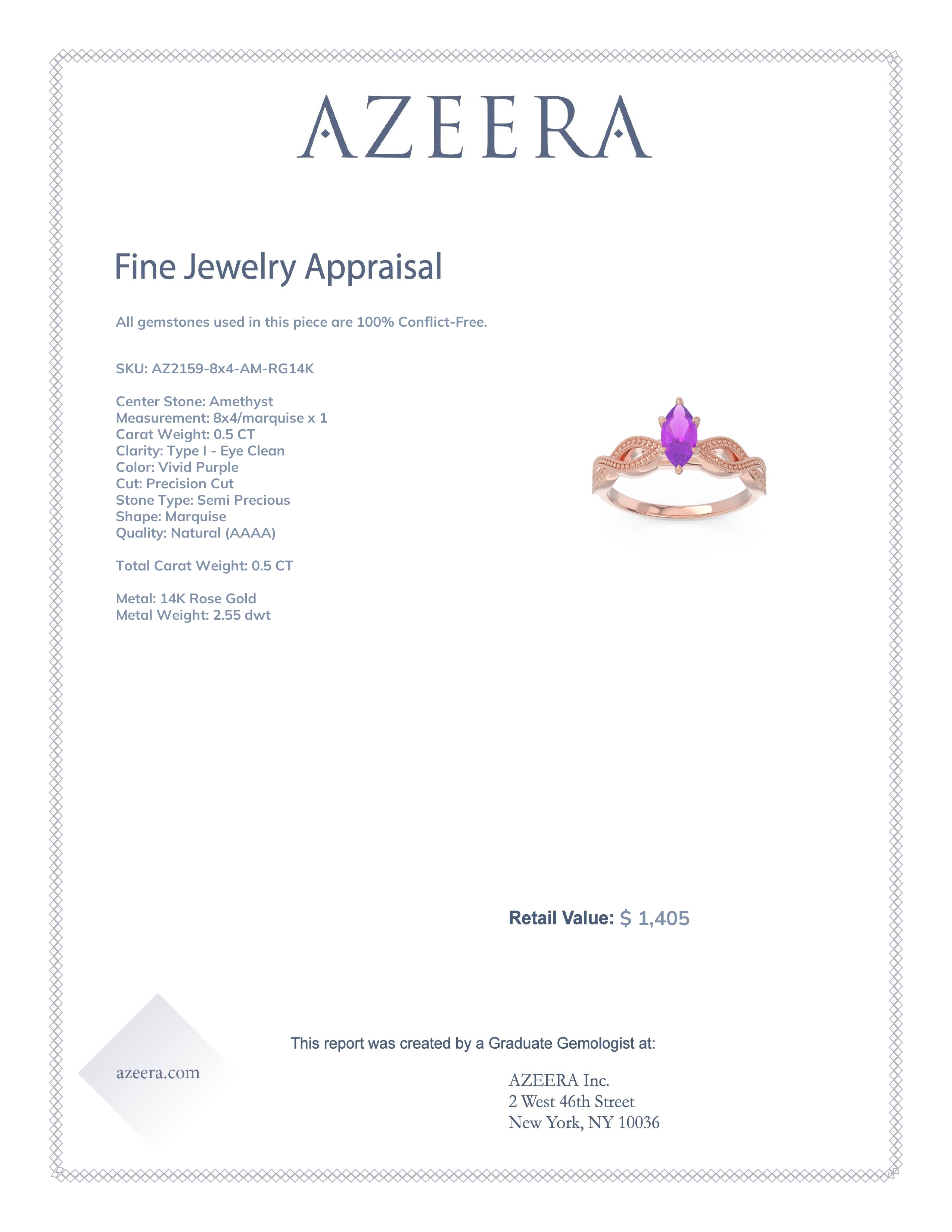This 14K Rose Gold Amethyst ring features a AAAA Marquise Amethyst stone, found across the finest boutiques in the world. We only use gems that are within the top 10% of material available. This ring can be worn as an Amethyst engagement ring, or can also be added to your collection of gemstone rings. This Solitaire Ring Features A Large Marquise Cut Gem Surrounded By 6 Claw Prongs in A Raised Setting with Milgrain Detail On A Braided Shank. Customize And Build Your Own Birthstone Ring By Selecting The Gems And Metals Of Your Choice. We offer Free Shipping and Free Returns, along with a Free Resize. This ring also comes with a lifetime warranty which covers the integrity of our workmanship forever.