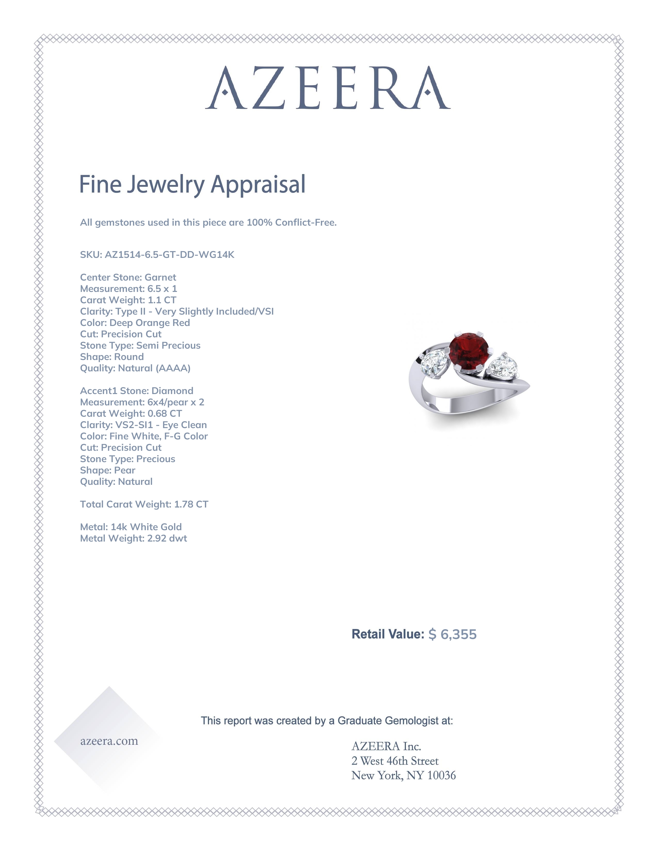 This 14k White Gold Garnet ring features a Emerald Garnet, along with fine quality Diamond. This Modern Ring Is Fun And Stylish. Your Round Brilliant Gem Sits in A 6 Prong Bypass Setting with A Knife Edge Band. The Center Stone Is Accented with Two Smaller Pear Shape Gems. We only use the top 10% of gems available, those found in the finest jewelry shops across the world. This Garnet engagement ring can also be worn as an Garnet and Diamond gemstone ring and added to your collection! Enjoy Free Shipping and Returns, Free Resize and a lifetime warranty.