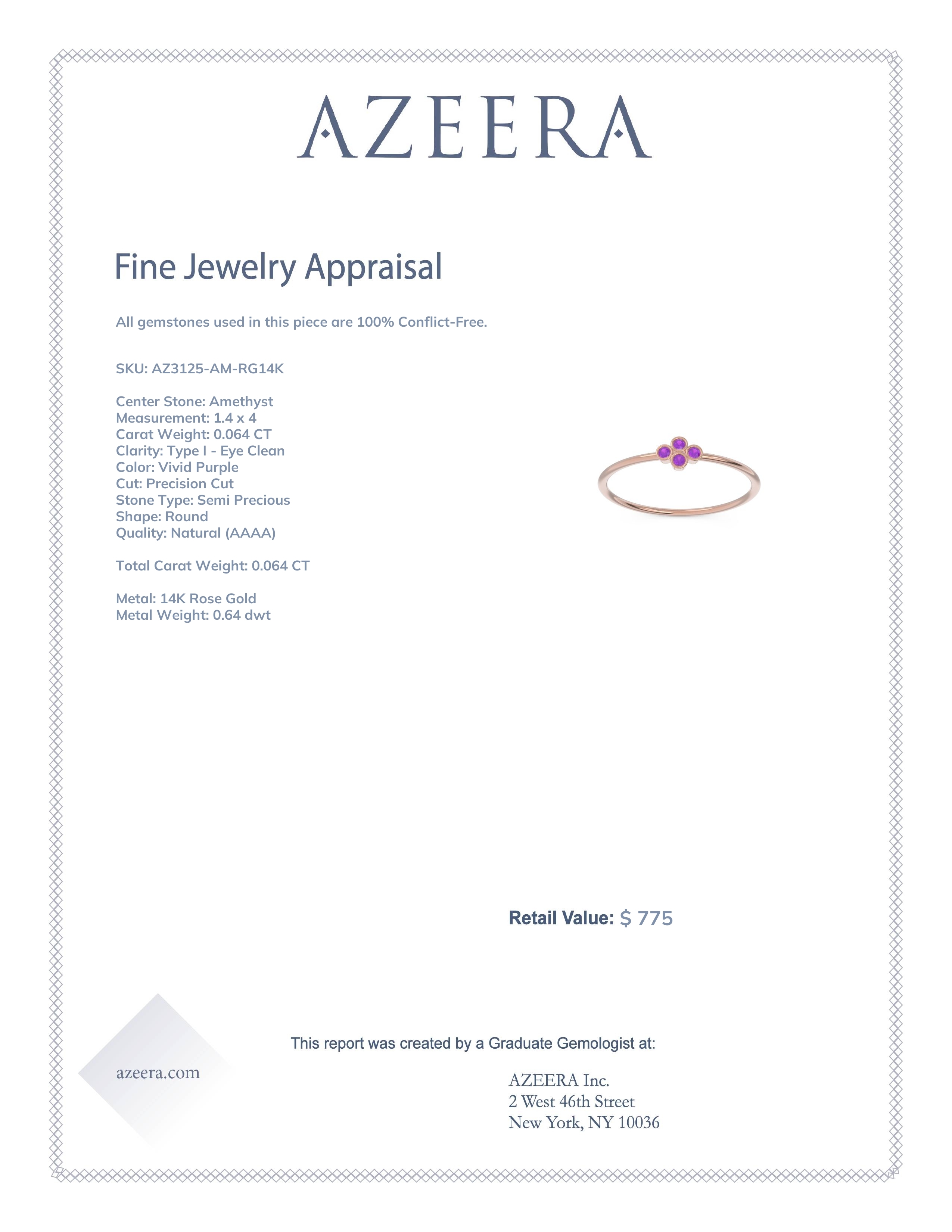 This 14K Rose Gold Amethyst ring is the perfect addition to you collection of Fashion Rings. From boardroom to beach bonfire, this transcends the ordinary. This Ring Features Four Round Brilliant Gems Bezel Set On A Slender Modern Setting. Gone are the days of chunky statements and over-the-top sparkle. Today, people are gravitating towards the quiet confidence of minimalist jewelry. These pieces complement, rather than compete with, personal style, allowing individuality to shine through.