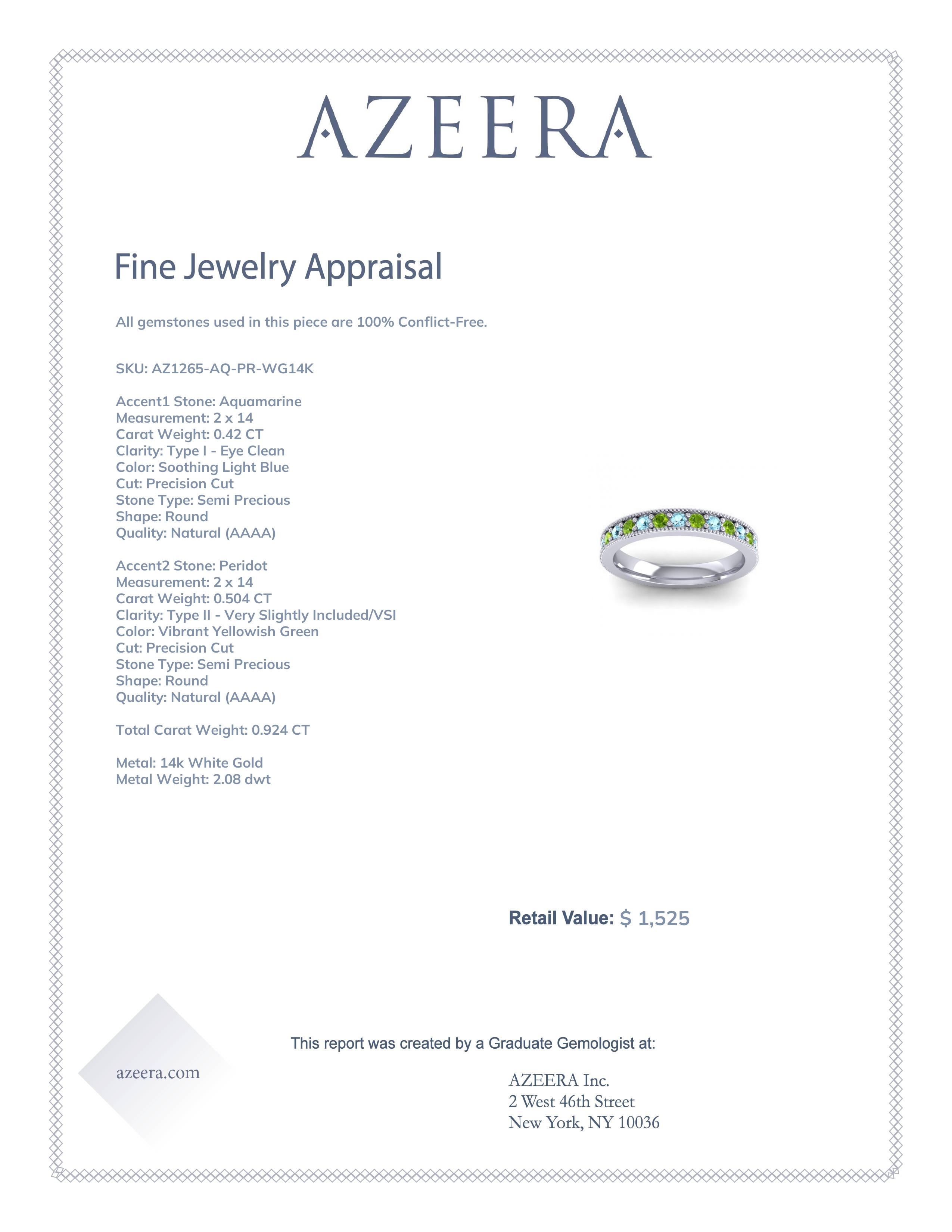 This Aquamarine wedding ring is casted in 14k White Gold and set with fine quality Aquamarine and Peridot. All of the gemstones we use are of the top 10% available, those found in fine quality boutiques across the world. This Aquamarine wedding band can also be added to your collection of minimalist Aquamarine rings. This Timeless Band Displays Cherished Elements Of Classical Jewelry Design. Your Round Colored Stones Sit in A 4 Prong Shared Setting Between Rows Of Milgrain Detail. Free shipping, returns, resizing, and a lifetime warranty ensure you love your purchase.
