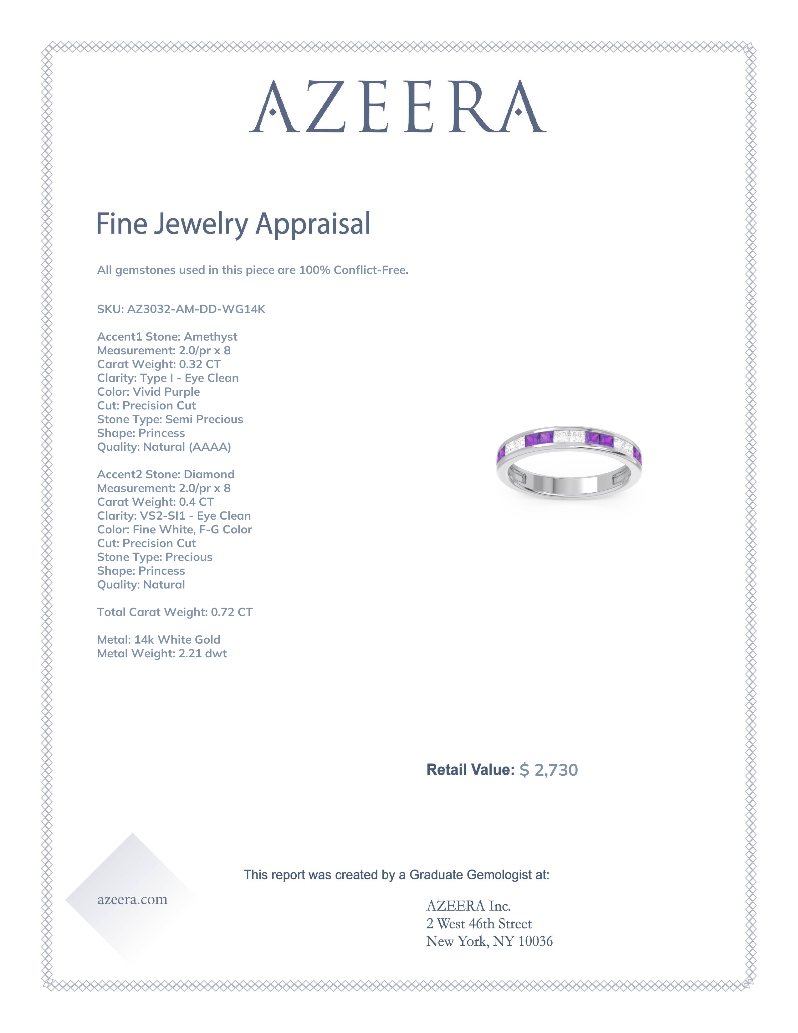 This Amethyst wedding ring is casted in 14k White Gold and set with fine quality Amethyst and Diamond. All of the gemstones we use are of the top 10% available, those found in fine quality boutiques across the world. This Amethyst wedding band can also be added to your collection of minimalist Amethyst rings. This Band Features Five Small Princess Cut Gems Channel Set in A Half Eternity Ring Around The Shank. Free shipping, returns, resizing, and a lifetime warranty ensure you love your purchase.