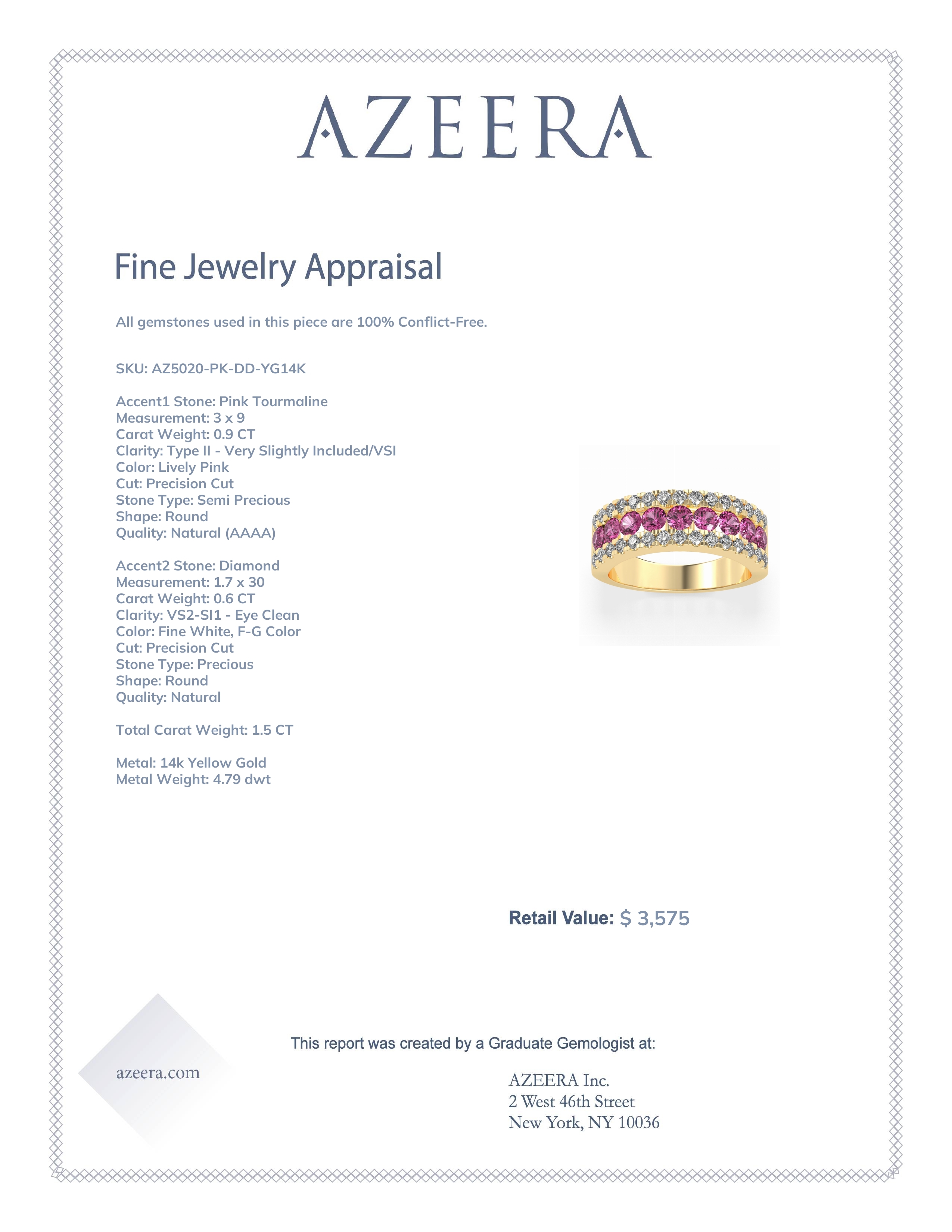 This Pink Tourmaline wedding ring is casted in 14k Yellow Gold and set with fine quality Pink Tourmaline and Diamond. All of the gemstones we use are of the top 10% available, those found in fine quality boutiques across the world. This Pink Tourmaline wedding band can also be added to your collection of minimalist Pink Tourmaline rings. This Band Features A Captivating Three-row Diamond Design, with A Central Row Of Larger Diamonds Flanked By Smaller Stones. Free shipping, returns, resizing, and a lifetime warranty ensure you love your purchase.