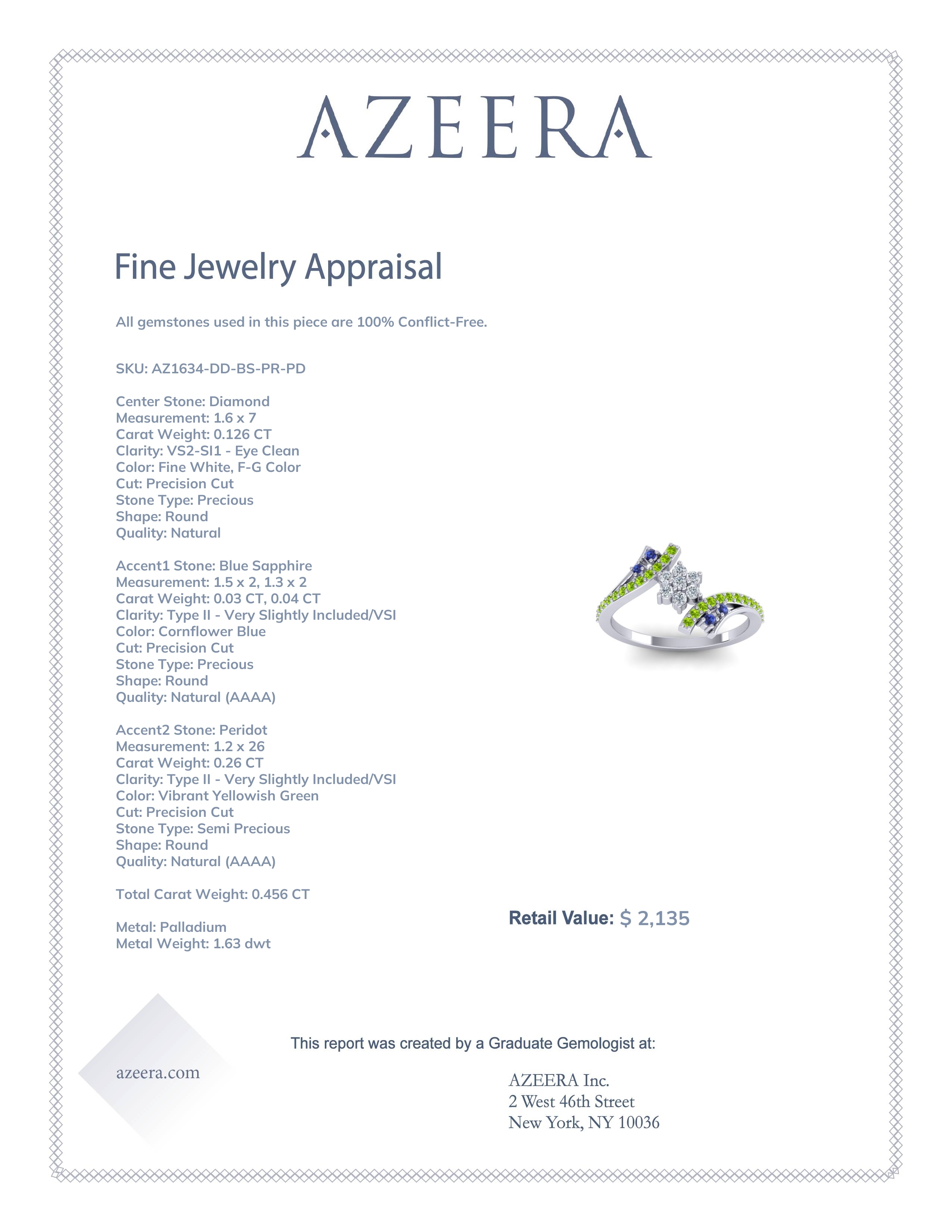 Embrace everyday sparkle and unleash your inner icon with our customizable Fashion Rings. This ring features AAAA Diamond, along with Blue Sapphire and Peridot. We only use the top 10% of gemstone material available, amongst those found in high end boutiques. This Fashion Ring is casted in Palladium. This Nature inspired Ring Features 7 Round Brilliant Gems Of Your Choice in A Cluster Setting Shaped Like A Flower. A Bypass Design with Additional Round Brilliant Gems in A Shared Prong Setting Holds The Center Of The Piece And Provides A Pleasant Accent. Whether you are looking for simple rings or dainty rings, this ring ticks all the boxes, this ring isn't just an accessory, it's a conversation starter.