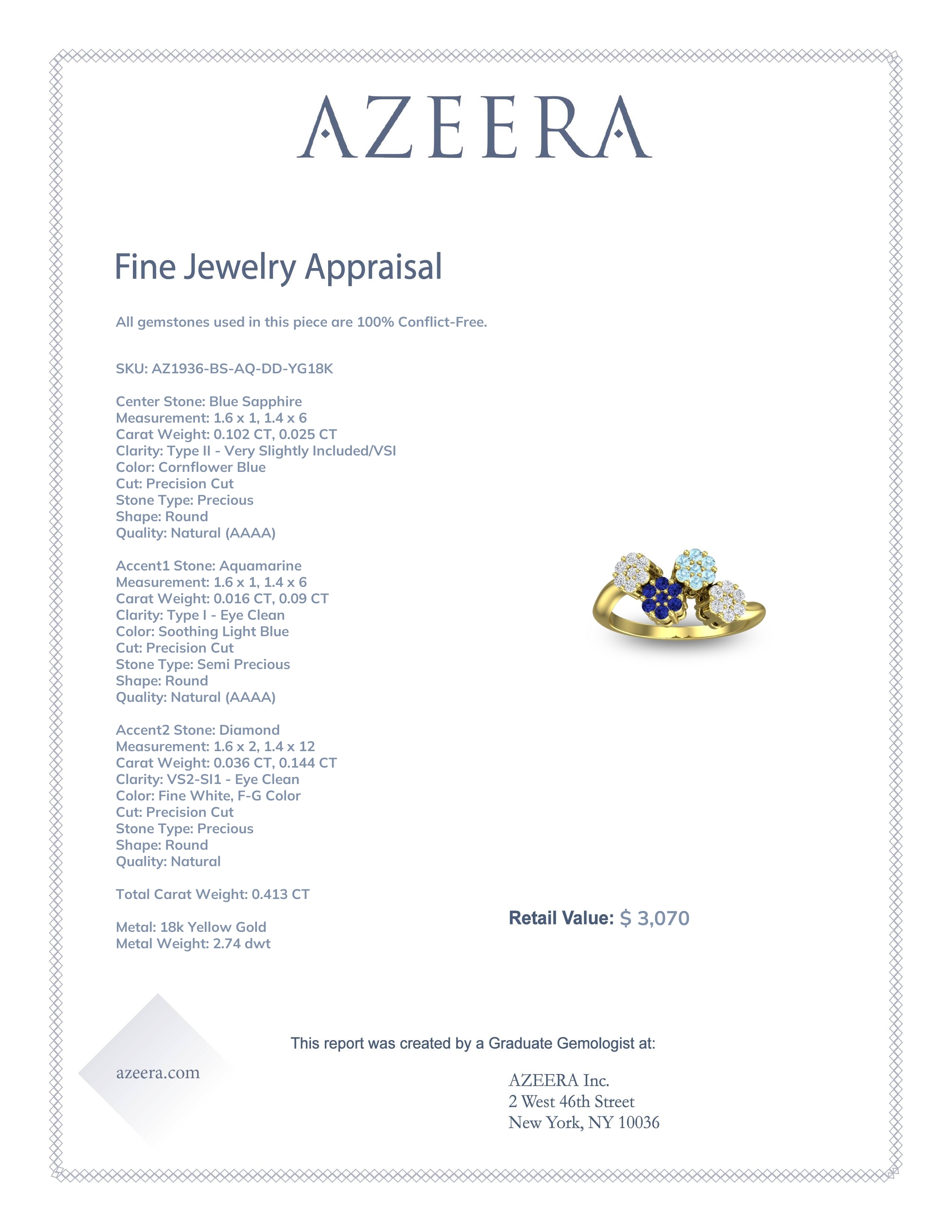 Embrace everyday sparkle and unleash your inner icon with our customizable Fashion Rings. This ring features Blue Sapphire, along with Aquamarine and Diamond. We only use the top 10% of gemstone material available, amongst those found in high end boutiques. This Fashion Ring is casted in 18k Yellow Gold. This Nature inspired Ring Features 28 Round Brilliant Gems Of Your Choice in Cluster Settings Shaped Like A Flowers Between A Modified Bypass Design. Whether you are looking for simple rings or dainty rings, this ring ticks all the boxes, this ring isn't just an accessory, it's a conversation starter.