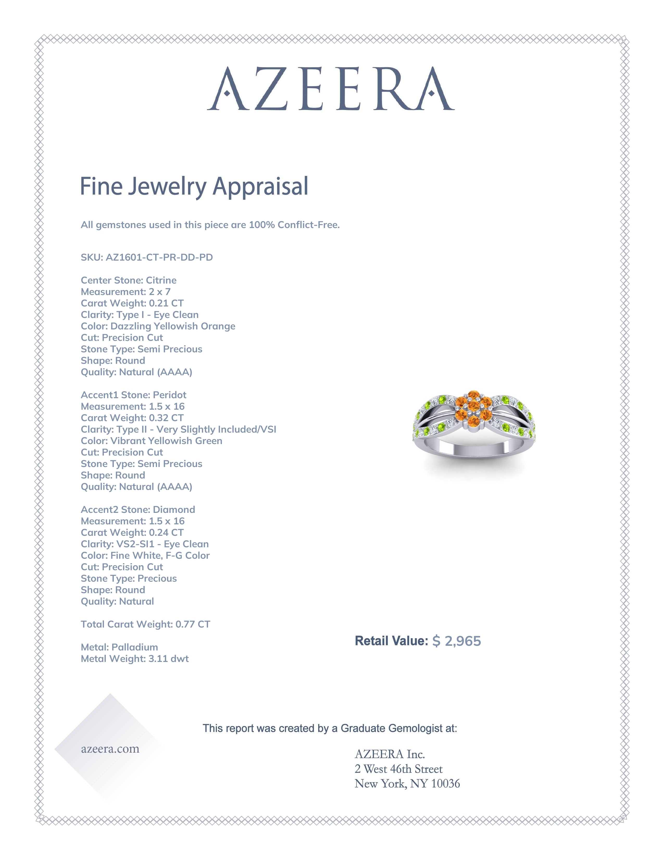 Embrace everyday sparkle and unleash your inner icon with our customizable Fashion Rings. This ring features Citrine, along with Peridot and Diamond. We only use the top 10% of gemstone material available, amongst those found in high end boutiques. This Fashion Ring is casted in Palladium. This Nature inspired Ring Features 7 Round Brilliant Gems Of Your Choice in A Cluster Setting Shaped Like A Flower. Slender Metal Bands And Curved Arms Of The Split Shank Setting That Are Accented with Smaller Round Brilliant Gems in Shared Prong Setting Secure The Center Of The Piece. Whether you are looking for simple rings or dainty rings, this ring ticks all the boxes, this ring isn't just an accessory, it's a conversation starter.