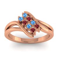 This Swiss Blue Topaz and Ruby ring is the perfect addition to you wardrobe. Not only do we use the top 10% of gemstones available, we also make everything right here in New York City. Our Fashion Rings can be added to your collection of dainty rings, or even to your collection of stacking rings. This Ring Features 8 Round Brilliant Gems Of Your Choice in A Pave Setting Of 2 Diagonal Rows. A Modified Split Shank Bypass Setting Supports The Center Of The Piece. Ditch the worry, embrace the shine with free shipping, returns, resizing and a lifetime warranty.