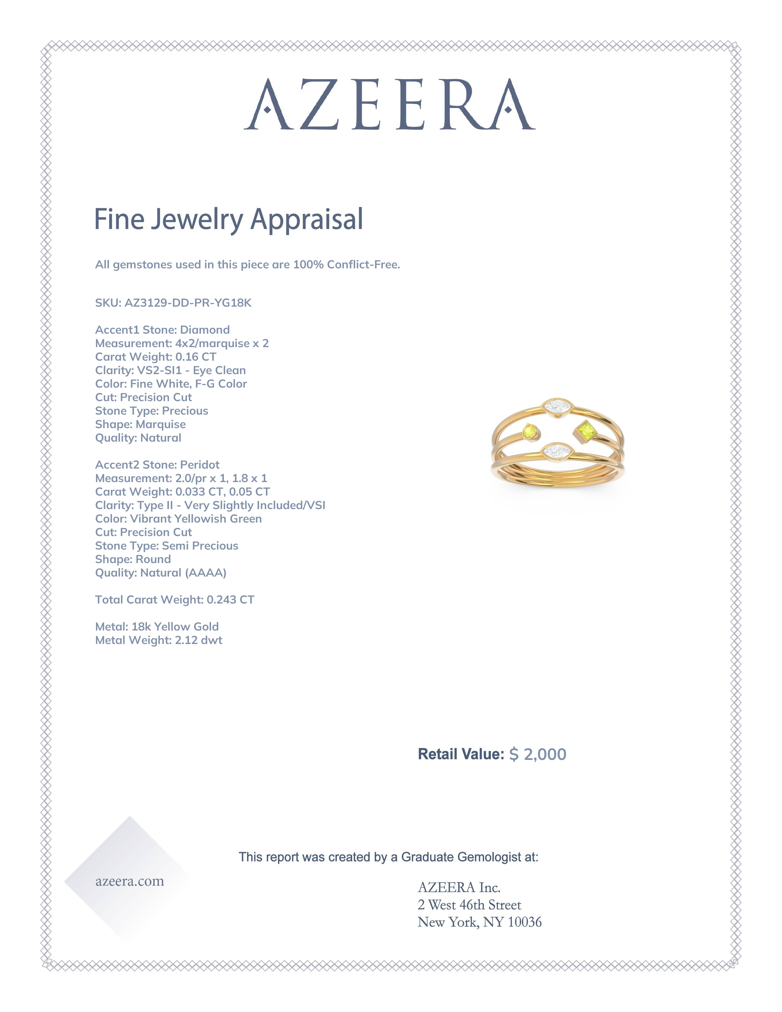 This Diamond and Peridot ring is the perfect addition to you wardrobe. Not only do we use the top 10% of gemstones available, we also make everything right here in New York City. Our Fashion Rings can be added to your collection of dainty rings, or even to your collection of stacking rings. This Ring Features Two Marquise Shaped And One Princess Cut Gem Bezel Set with One Round Brilliant Gem Prong Set in A Triple Line Setting with The Middle Line in The Open Style. Ditch the worry, embrace the shine with free shipping, returns, resizing and a lifetime warranty.