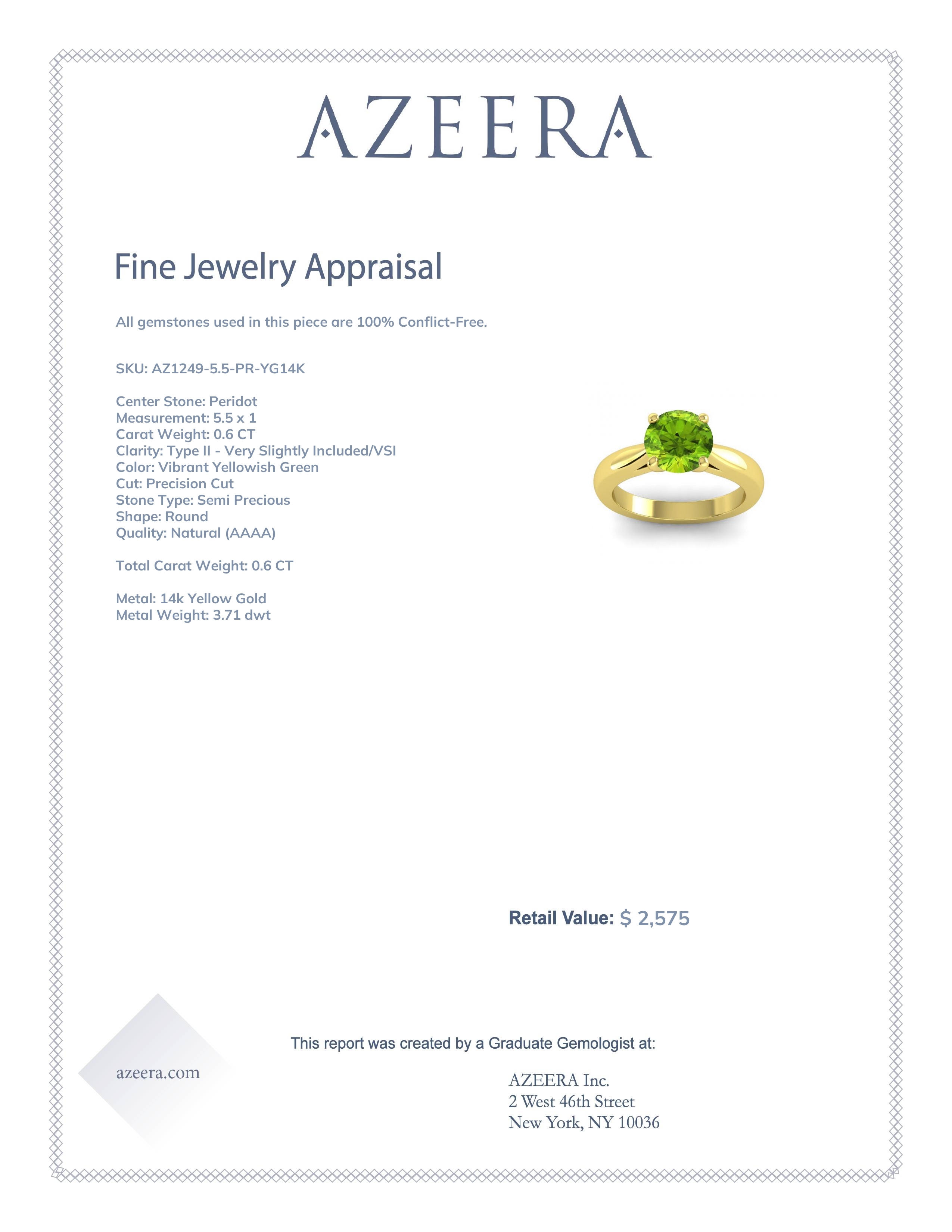 This 14k Yellow Gold Peridot ring features a AAAA Round Peridot stone, found across the finest boutiques in the world. We only use gems that are within the top 10% of material available. This ring can be worn as an Peridot engagement ring, or can also be added to your collection of gemstone rings. This Minimalist Ring Is Timeless And Elegant. Your Round Brilliant Gem Sits in A Raised 4 Prong Peg Head Cathedral Setting. We offer Free Shipping and Free Returns, along with a Free Resize. This ring also comes with a lifetime warranty which covers the integrity of our workmanship forever.