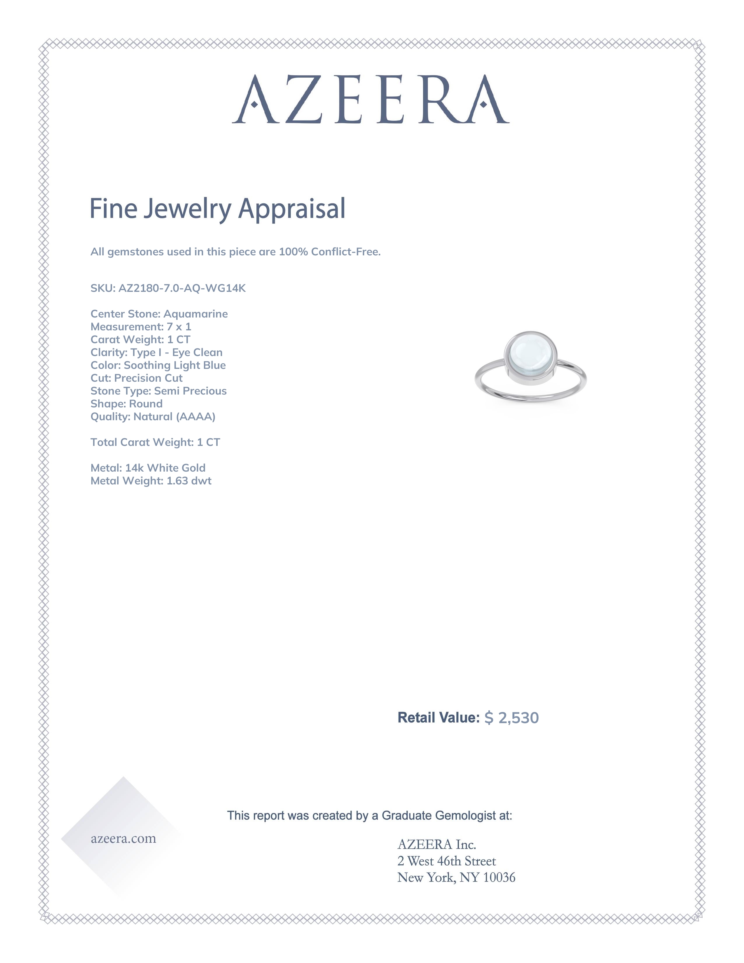 This 14k White Gold Aquamarine ring features a AAAA Round Aquamarine stone, found across the finest boutiques in the world. We only use gems that are within the top 10% of material available. This ring can be worn as an Aquamarine engagement ring, or can also be added to your collection of gemstone rings. This Solitaire Ring Features A Large Round Cabochon Gem in A Bezel Setting. Customize And Build Your Own Gemstone Ring By Selecting The Gems And Metals Of Your Choice. We offer Free Shipping and Free Returns, along with a Free Resize. This ring also comes with a lifetime warranty which covers the integrity of our workmanship forever.
