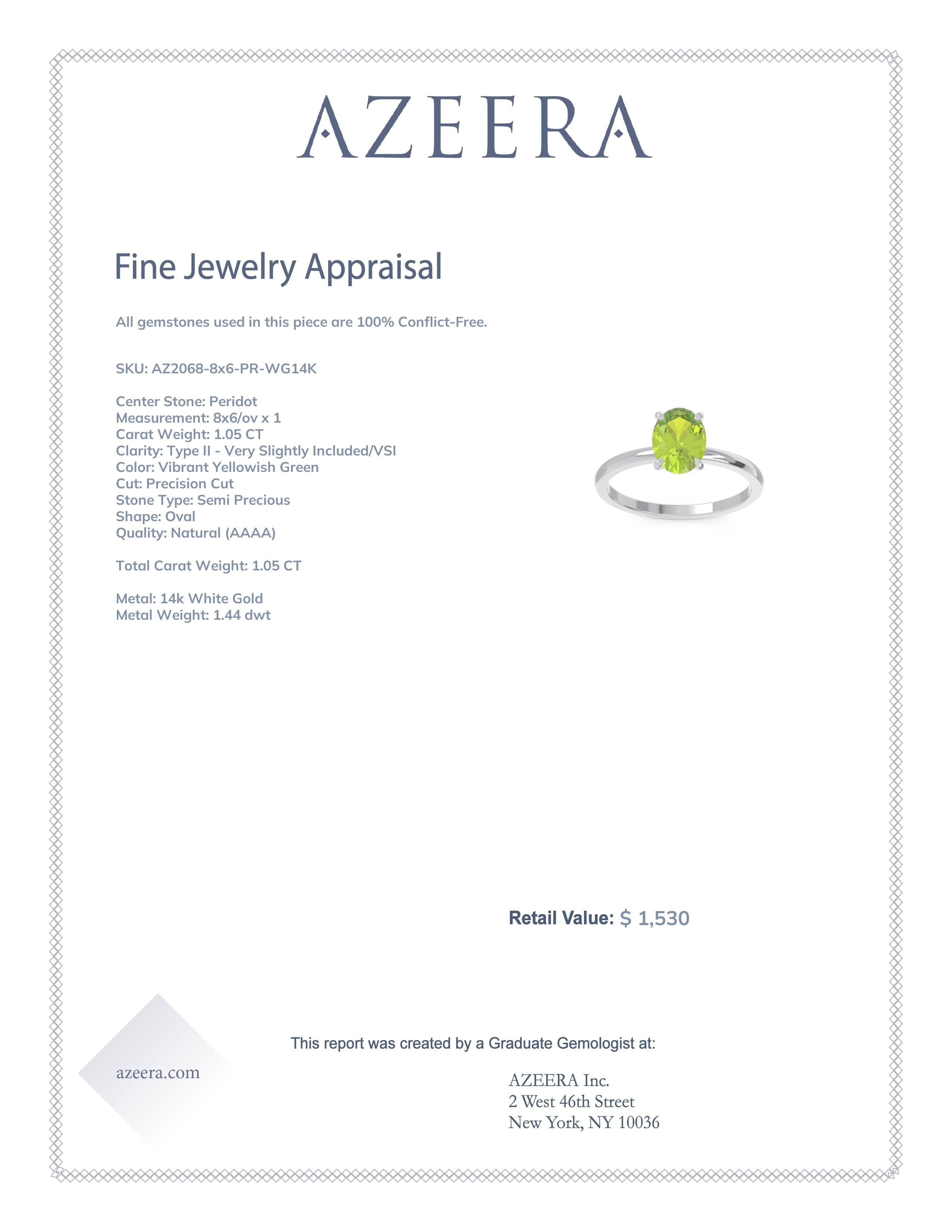 This 14k White Gold Peridot ring features a AAAA Oval Peridot stone, found across the finest boutiques in the world. We only use gems that are within the top 10% of material available. This ring can be worn as an Peridot engagement ring, or can also be added to your collection of gemstone rings. This Solitaire Ring Features A Large Oval Gem in Claw Prong Setting. We offer Free Shipping and Free Returns, along with a Free Resize. This ring also comes with a lifetime warranty which covers the integrity of our workmanship forever.