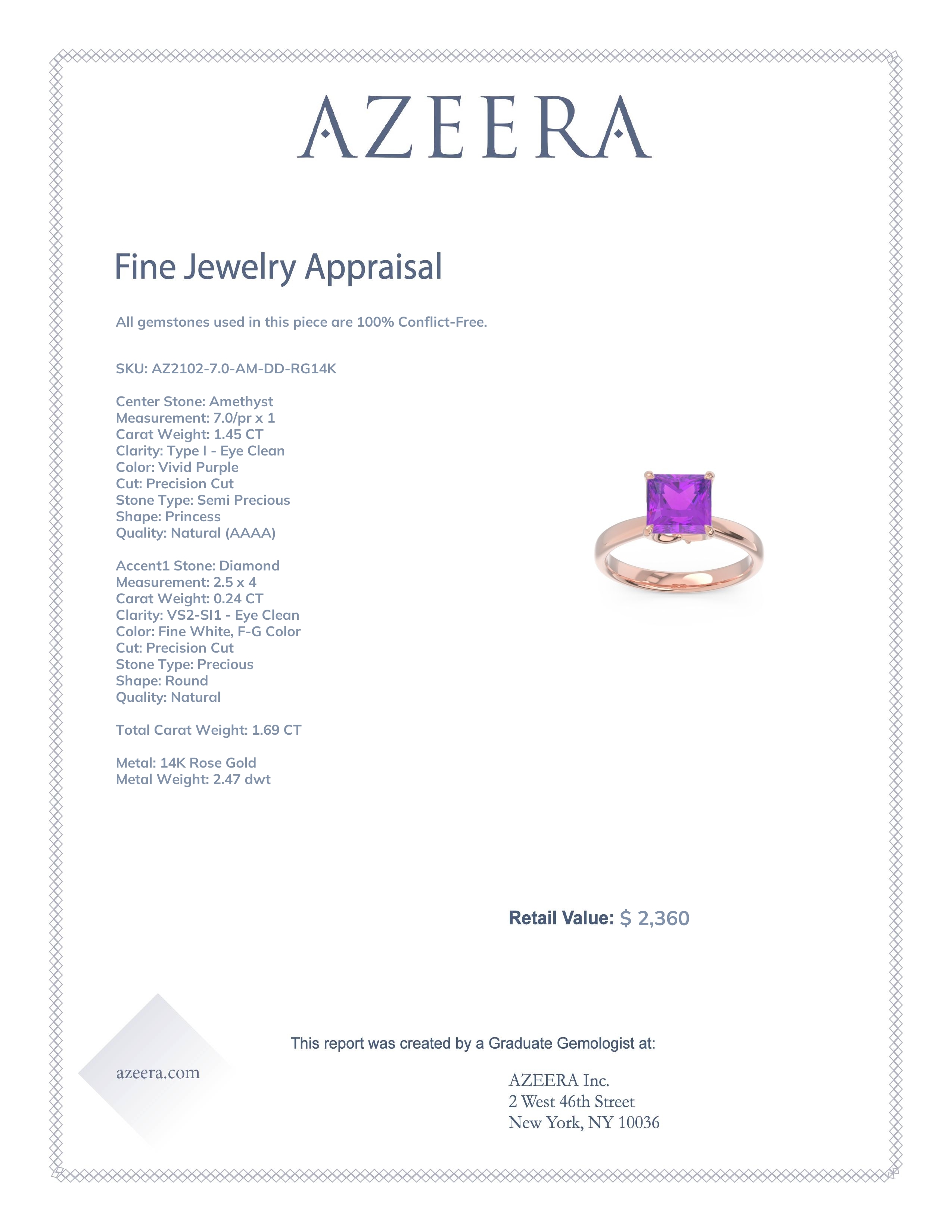 This 14K Rose Gold Amethyst ring features a Princess Amethyst, along with fine quality Diamond. This Ring Features A Large Princess Cut Square Gem in A Raised 4 Claw Prong Setting with Small Round Brilliant Gems Decorating The Basket Below The Center Stone. We only use the top 10% of gems available, those found in the finest jewelry shops across the world. This Amethyst engagement ring can also be worn as an Amethyst and Diamond gemstone ring and added to your collection! Enjoy Free Shipping and Returns, Free Resize and a lifetime warranty.