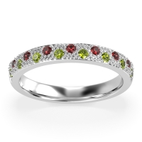 This Peridot wedding ring is casted in 14k White Gold and set with fine quality Peridot and Ruby. All of the gemstones we use are of the top 10% available, those found in fine quality boutiques across the world. This Peridot wedding band can also be added to your collection of minimalist Peridot rings. This Half-eternity Band Features Gemstones And Milgrain Accents, Creating A Sparkling, Starry Effect. Free shipping, returns, resizing, and a lifetime warranty ensure you love your purchase.