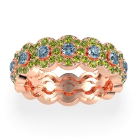 This Peridot wedding ring is casted in 14K Rose Gold and set with fine quality Peridot and Aquamarine. All of the gemstones we use are of the top 10% available, those found in fine quality boutiques across the world. This Peridot wedding band can also be added to your collection of minimalist Peridot rings. This Eternity Band Features A Larger Center Stone Encircled By A Sparkling Halo, in A Repeating Pattern Going All The Way Around. Free shipping, returns, resizing, and a lifetime warranty ensure you love your purchase.