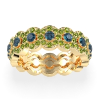This Peridot wedding ring is casted in 14k Yellow Gold and set with fine quality Peridot and London Blue Topaz. All of the gemstones we use are of the top 10% available, those found in fine quality boutiques across the world. This Peridot wedding band can also be added to your collection of minimalist Peridot rings. This Eternity Band Features A Larger Center Stone Encircled By A Sparkling Halo, in A Repeating Pattern Going All The Way Around. Free shipping, returns, resizing, and a lifetime warranty ensure you love your purchase.