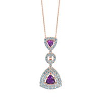 This Amethyst and Aquamarine Necklace is casted in 14K Rose Gold. This Women’s Fashion necklace features exceptionally fine gemstones, on par with those found in the world's most exclusive boutiques and among the top 10% available globally. intriguing Pendant with A Distinctive Shovel-like Silhouette, Showcasing A Vibrant Trillion-cut Stone As Its Focal Point. The Gem Is Further Enhanced By A Double Halo Of Shimmering Accents. This necklace comes with a complimentary 18-inch chain. Enjoy the confidence of our 30-day, stress-free return policy—with return shipping fully covered. Each piece is also accompanied by a Lifetime Warranty, ensuring lasting beauty and peace of mind.