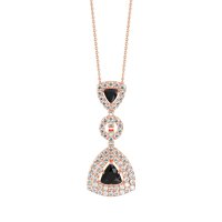 This Black Onyx and Lab Diamond Necklace is casted in 14K Rose Gold. This Women’s Fashion necklace features exceptionally fine gemstones, on par with those found in the world's most exclusive boutiques and among the top 10% available globally. intriguing Pendant with A Distinctive Shovel-like Silhouette, Showcasing A Vibrant Trillion-cut Stone As Its Focal Point. The Gem Is Further Enhanced By A Double Halo Of Shimmering Accents. This necklace comes with a complimentary 18-inch chain. Enjoy the confidence of our 30-day, stress-free return policy—with return shipping fully covered. Each piece is also accompanied by a Lifetime Warranty, ensuring lasting beauty and peace of mind.