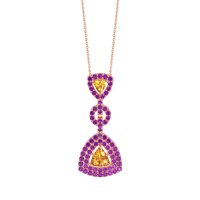 This Citrine and Amethyst Necklace is casted in 14K Rose Gold. This Women’s Fashion necklace features exceptionally fine gemstones, on par with those found in the world's most exclusive boutiques and among the top 10% available globally. intriguing Pendant with A Distinctive Shovel-like Silhouette, Showcasing A Vibrant Trillion-cut Stone As Its Focal Point. The Gem Is Further Enhanced By A Double Halo Of Shimmering Accents. This necklace comes with a complimentary 18-inch chain. Enjoy the confidence of our 30-day, stress-free return policy—with return shipping fully covered. Each piece is also accompanied by a Lifetime Warranty, ensuring lasting beauty and peace of mind.