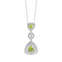 This Peridot and Lab Diamond Necklace is casted in Platinum. This Women’s Fashion necklace features exceptionally fine gemstones, on par with those found in the world's most exclusive boutiques and among the top 10% available globally. intriguing Pendant with A Distinctive Shovel-like Silhouette, Showcasing A Vibrant Trillion-cut Stone As Its Focal Point. The Gem Is Further Enhanced By A Double Halo Of Shimmering Accents. This necklace comes with a complimentary 18-inch chain. Enjoy the confidence of our 30-day, stress-free return policy—with return shipping fully covered. Each piece is also accompanied by a Lifetime Warranty, ensuring lasting beauty and peace of mind.