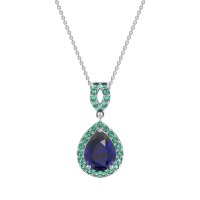 This Blue Sapphire and Emerald Necklace is casted in 14k White Gold. This Women’s Halo necklace features exceptionally fine gemstones, on par with those found in the world's most exclusive boutiques and among the top 10% available globally. Elegant Tear Drop Pendant Featuring A Central, Pear-shaped Stone Surrounded By A Halo Of Smaller Stones. The Bail Is Also Embellished with Delicate Stone Accents. This necklace comes with a complimentary 18-inch chain. Enjoy the confidence of our 30-day, stress-free return policy—with return shipping fully covered. Each piece is also accompanied by a Lifetime Warranty, ensuring lasting beauty and peace of mind.