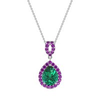 This Lab Emerald and Amethyst Necklace is casted in 14k White Gold. This Women’s Halo necklace features exceptionally fine gemstones, on par with those found in the world's most exclusive boutiques and among the top 10% available globally. Elegant Tear Drop Pendant Featuring A Central, Pear-shaped Stone Surrounded By A Halo Of Smaller Stones. The Bail Is Also Embellished with Delicate Stone Accents. This necklace comes with a complimentary 18-inch chain. Enjoy the confidence of our 30-day, stress-free return policy—with return shipping fully covered. Each piece is also accompanied by a Lifetime Warranty, ensuring lasting beauty and peace of mind.