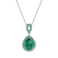 This Lab Emerald and Emerald Necklace is casted in 14k White Gold. This Women’s Halo necklace features exceptionally fine gemstones, on par with those found in the world's most exclusive boutiques and among the top 10% available globally. Elegant Tear Drop Pendant Featuring A Central, Pear-shaped Stone Surrounded By A Halo Of Smaller Stones. The Bail Is Also Embellished with Delicate Stone Accents. This necklace comes with a complimentary 18-inch chain. Enjoy the confidence of our 30-day, stress-free return policy—with return shipping fully covered. Each piece is also accompanied by a Lifetime Warranty, ensuring lasting beauty and peace of mind.