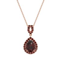 This Ruby Halo Necklace is casted in 14K Rose Gold. We use only exceptionally fine gemstones, truly on par with those found in the world's most exclusive boutiques and representing the top 10% available globally. Elegant Tear Drop Pendant Featuring A Central, Pear-shaped Stone Surrounded By A Halo Of Smaller Stones. The Bail Is Also Embellished with Delicate Stone Accents. You'll get a complimentary 18-inch chain with every necklace. Plus, enjoy a 30-day, hassle-free return policy (we even cover return shipping!) and a Lifetime Warranty for peace of mind.