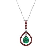 This Emerald and Ruby Necklace is casted in 14k White Gold. This Women’s Fashion necklace features exceptionally fine gemstones, on par with those found in the world's most exclusive boutiques and among the top 10% available globally. Captivating Pendant Showcasing A Pear-shaped Center Stone Framed By A Large Halo. This necklace comes with a complimentary 18-inch chain. Enjoy the confidence of our 30-day, stress-free return policy—with return shipping fully covered. Each piece is also accompanied by a Lifetime Warranty, ensuring lasting beauty and peace of mind.