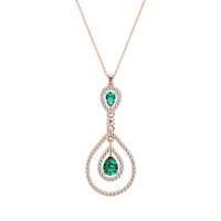 This Emerald and Lab Diamond Necklace is casted in 14K Rose Gold. This Women’s Fashion necklace features exceptionally fine gemstones, on par with those found in the world's most exclusive boutiques and among the top 10% available globally. This Teardrop Pendant Showcases A Pear-shaped Center Stone Embraced By A Teardrop-shaped Halo. The Design Is Further Enhanced By An Outer Teardrop Halo, Creating A Captivating And Layered Effect. This necklace comes with a complimentary 18-inch chain. Enjoy the confidence of our 30-day, stress-free return policy—with return shipping fully covered. Each piece is also accompanied by a Lifetime Warranty, ensuring lasting beauty and peace of mind.