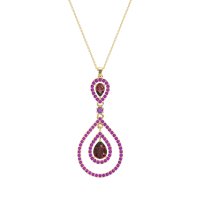 This Ruby and Amethyst Necklace is casted in 14k Yellow Gold. This Women’s Fashion necklace features exceptionally fine gemstones, on par with those found in the world's most exclusive boutiques and among the top 10% available globally. This Teardrop Pendant Showcases A Pear-shaped Center Stone Embraced By A Teardrop-shaped Halo. The Design Is Further Enhanced By An Outer Teardrop Halo, Creating A Captivating And Layered Effect. This necklace comes with a complimentary 18-inch chain. Enjoy the confidence of our 30-day, stress-free return policy—with return shipping fully covered. Each piece is also accompanied by a Lifetime Warranty, ensuring lasting beauty and peace of mind.
