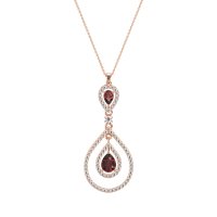 This Ruby and Lab Diamond Necklace is casted in 18K Rose Gold. This Women’s Fashion necklace features exceptionally fine gemstones, on par with those found in the world's most exclusive boutiques and among the top 10% available globally. This Teardrop Pendant Showcases A Pear-shaped Center Stone Embraced By A Teardrop-shaped Halo. The Design Is Further Enhanced By An Outer Teardrop Halo, Creating A Captivating And Layered Effect. This necklace comes with a complimentary 18-inch chain. Enjoy the confidence of our 30-day, stress-free return policy—with return shipping fully covered. Each piece is also accompanied by a Lifetime Warranty, ensuring lasting beauty and peace of mind.