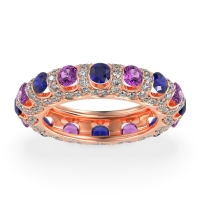 This 14K Rose Gold Blue Sapphire wedding ring features gemstones, along with fine quality Amethyst and Diamond. We only use the top 10% of gemstones available. This women's ring can be worn as a Blue Sapphire wedding band, or even as an addition to your Blue Sapphire rings collection. This Eternity Band Features Larger, Tension-set Center Stones Surrounded By A Continuous Halo Of Smaller Diamonds, Creating A Dazzling 360-degree Sparkle. This product comes with Free Shipping, Free Returns, Free Resize and a lifetime warranty. Choose from a variety of gems and metals to make a truly unique custom band!.
