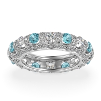 This Diamond wedding ring is casted in 14k White Gold and set with fine quality Diamond and Swiss Blue Topaz. All of the gemstones we use are of the top 10% available, those found in fine quality boutiques across the world. This Diamond wedding band can also be added to your collection of minimalist Diamond rings. This Eternity Band Features Larger, Tension-set Center Stones Surrounded By A Continuous Halo Of Smaller Diamonds, Creating A Dazzling 360-degree Sparkle. Free shipping, returns, resizing, and a lifetime warranty ensure you love your purchase.