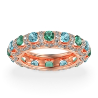 This 14K Rose Gold Emerald wedding ring features gemstones, along with fine quality Swiss Blue Topaz and Diamond. We only use the top 10% of gemstones available. This women's ring can be worn as a Emerald wedding band, or even as an addition to your Emerald rings collection. This Eternity Band Features Larger, Tension-set Center Stones Surrounded By A Continuous Halo Of Smaller Diamonds, Creating A Dazzling 360-degree Sparkle. This product comes with Free Shipping, Free Returns, Free Resize and a lifetime warranty. Choose from a variety of gems and metals to make a truly unique custom band!.