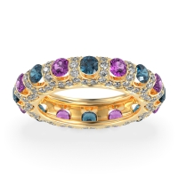 This 14k Yellow Gold London Blue Topaz wedding ring features gemstones, along with fine quality Amethyst and Diamond. We only use the top 10% of gemstones available. This women's ring can be worn as a London Blue Topaz wedding band, or even as an addition to your London Blue Topaz rings collection. This Eternity Band Features Larger, Tension-set Center Stones Surrounded By A Continuous Halo Of Smaller Diamonds, Creating A Dazzling 360-degree Sparkle. This product comes with Free Shipping, Free Returns, Free Resize and a lifetime warranty. Choose from a variety of gems and metals to make a truly unique custom band!.