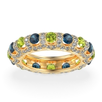 This 14k Yellow Gold Peridot wedding ring features gemstones, along with fine quality London Blue Topaz and Diamond. We only use the top 10% of gemstones available. This women's ring can be worn as a Peridot wedding band, or even as an addition to your Peridot rings collection. This Eternity Band Features Larger, Tension-set Center Stones Surrounded By A Continuous Halo Of Smaller Diamonds, Creating A Dazzling 360-degree Sparkle. This product comes with Free Shipping, Free Returns, Free Resize and a lifetime warranty. Choose from a variety of gems and metals to make a truly unique custom band!.
