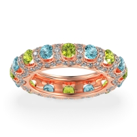 This 18K Rose Gold Peridot wedding ring features gemstones, along with fine quality Swiss Blue Topaz and Diamond. We only use the top 10% of gemstones available. This women's ring can be worn as a Peridot wedding band, or even as an addition to your Peridot rings collection. This Eternity Band Features Larger, Tension-set Center Stones Surrounded By A Continuous Halo Of Smaller Diamonds, Creating A Dazzling 360-degree Sparkle. This product comes with Free Shipping, Free Returns, Free Resize and a lifetime warranty. Choose from a variety of gems and metals to make a truly unique custom band!.