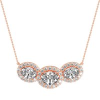 This Lab Diamond Halo Necklace is casted in 14K Rose Gold. We use only exceptionally fine gemstones, truly on par with those found in the world's most exclusive boutiques and representing the top 10% available globally. Striking Pendant Showcasing Three Oval-shaped Gems Aligned Horizontally, Each Framed By A Sparkling Halo Of Smaller Stones. A Bold And Radiant Statement Piece. You'll get a complimentary 18-inch chain with every necklace. Plus, enjoy a 30-day, hassle-free return policy (we even cover return shipping!) and a Lifetime Warranty for peace of mind.