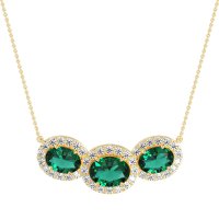 This Lab Emerald and Lab Diamond Necklace is casted in 14k Yellow Gold. This Women’s Halo necklace features exceptionally fine gemstones, on par with those found in the world's most exclusive boutiques and among the top 10% available globally. Striking Pendant Showcasing Three Oval-shaped Gems Aligned Horizontally, Each Framed By A Sparkling Halo Of Smaller Stones. A Bold And Radiant Statement Piece. This necklace comes with a complimentary 18-inch chain. Enjoy the confidence of our 30-day, stress-free return policy—with return shipping fully covered. Each piece is also accompanied by a Lifetime Warranty, ensuring lasting beauty and peace of mind.
