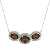 This Ruby and Peridot Necklace is casted in 14k White Gold. This Women’s Halo necklace features exceptionally fine gemstones, on par with those found in the world's most exclusive boutiques and among the top 10% available globally. Striking Pendant Showcasing Three Oval-shaped Gems Aligned Horizontally, Each Framed By A Sparkling Halo Of Smaller Stones. A Bold And Radiant Statement Piece. This necklace comes with a complimentary 18-inch chain. Enjoy the confidence of our 30-day, stress-free return policy—with return shipping fully covered. Each piece is also accompanied by a Lifetime Warranty, ensuring lasting beauty and peace of mind.