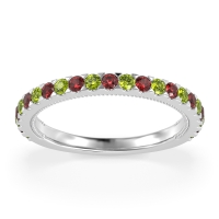 This Peridot wedding ring is casted in Palladium and set with fine quality Peridot and Ruby. All of the gemstones we use are of the top 10% available, those found in fine quality boutiques across the world. This Peridot wedding band can also be added to your collection of minimalist Peridot rings. Complete Your Ring Stack with This Glamorous Three-quarter Eternity Pave Band. Free shipping, returns, resizing, and a lifetime warranty ensure you love your purchase.