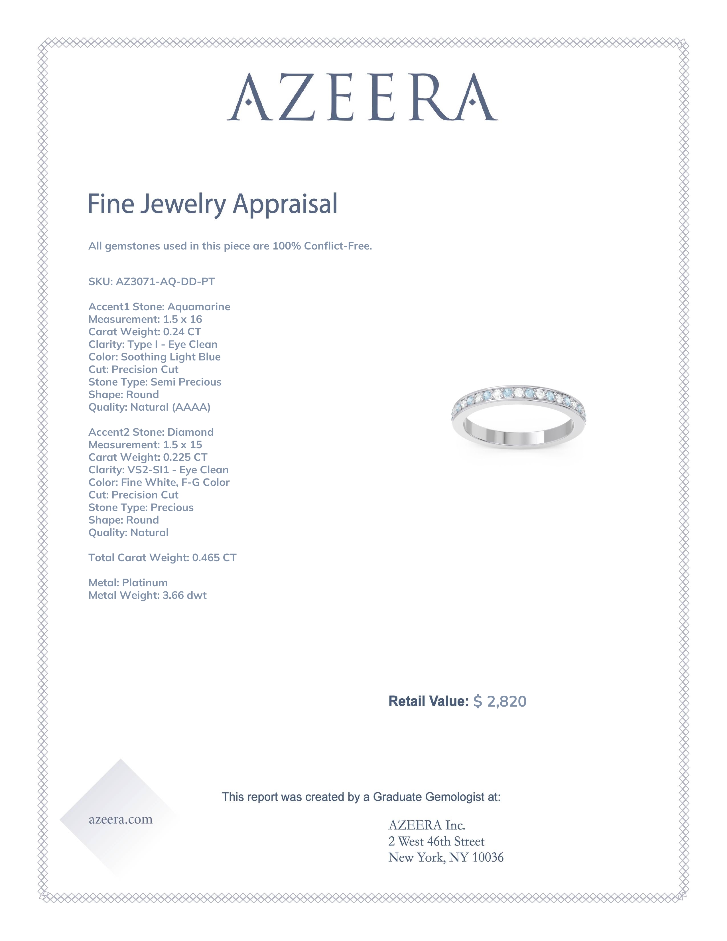 This Aquamarine wedding ring is casted in Platinum and set with fine quality Aquamarine and Diamond. All of the gemstones we use are of the top 10% available, those found in fine quality boutiques across the world. This Aquamarine wedding band can also be added to your collection of minimalist Aquamarine rings. This Ring Features Round Brilliant Gems Prong Set Between Two Secure Walls Three Quarters Of The Way Around The Shank. Customize And Build Your Own Gemstone Ring By Selecting The Gems And Metals Of Your Choice. Free shipping, returns, resizing, and a lifetime warranty ensure you love your purchase.