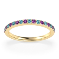 This Amethyst wedding ring is casted in 18k Yellow Gold and set with fine quality Amethyst and Swiss Blue Topaz. All of the gemstones we use are of the top 10% available, those found in fine quality boutiques across the world. This Amethyst wedding band can also be added to your collection of minimalist Amethyst rings. This Classic Wedding Band, Is Perfect To Stack, Or Pair with Your Exisiting Engagment Ring. Free shipping, returns, resizing, and a lifetime warranty ensure you love your purchase.