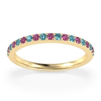 This Swiss Blue Topaz wedding ring is casted in 18k Yellow Gold and set with fine quality Swiss Blue Topaz and Pink Tourmaline. All of the gemstones we use are of the top 10% available, those found in fine quality boutiques across the world. This Swiss Blue Topaz wedding band can also be added to your collection of minimalist Swiss Blue Topaz rings. This Classic Wedding Band, Is Perfect To Stack, Or Pair with Your Exisiting Engagment Ring. Free shipping, returns, resizing, and a lifetime warranty ensure you love your purchase.
